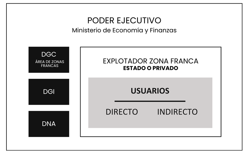 La administración y supervisión se encuentra a cargo del Ministerio de Economía y Finanzas (MEF) a través de la Dirección General de Comercio (DGC) – Área Zonas Francas (AZF). Es el organismo interlocutor principal para todas las reglamentaciones, permisos y controles referidos a todas las zonas francas del país.