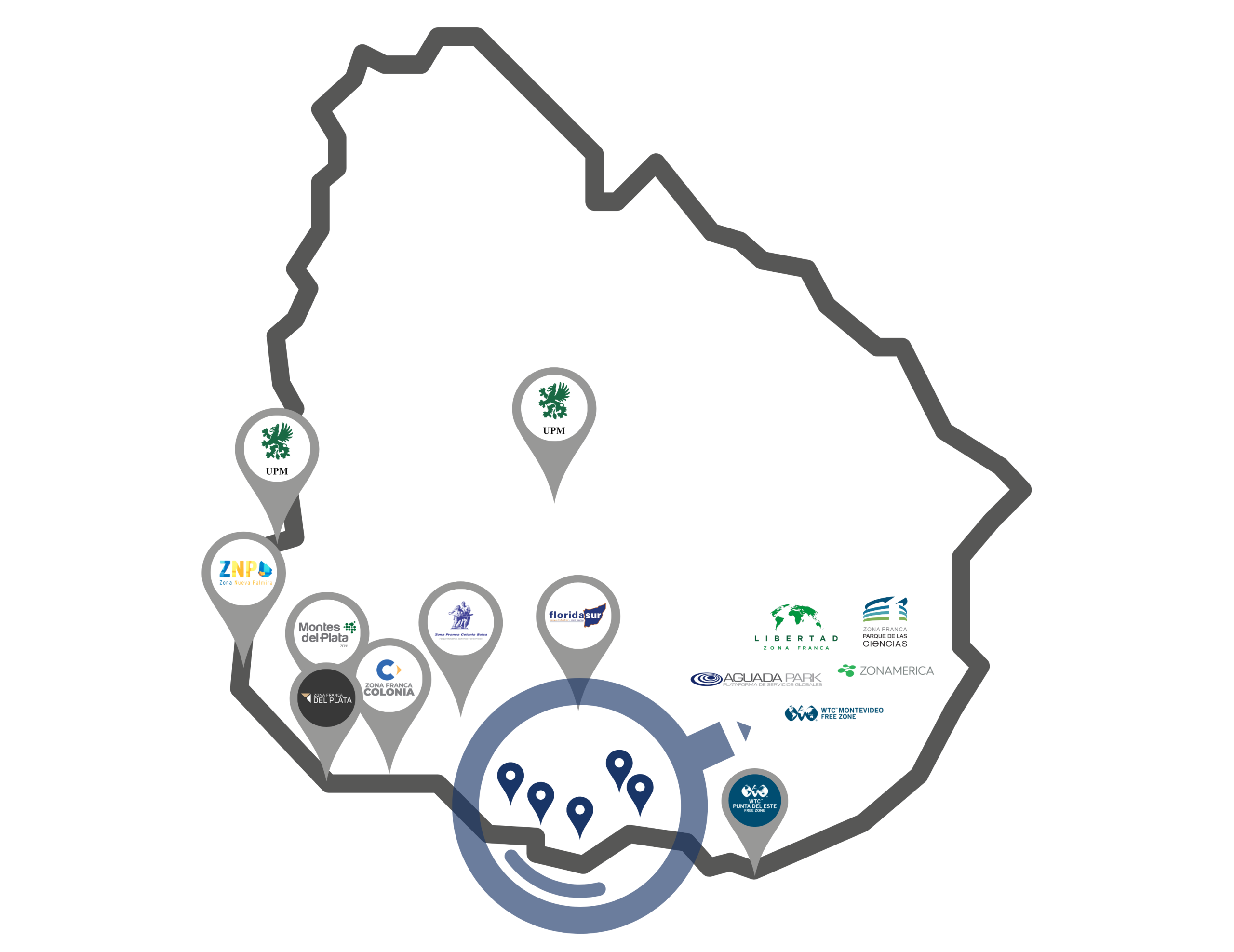 Uruguay cuenta en la actualidad con 14 zonas francas con diversas especializaciones, la mayoría de ellas próximas al área metropolitana. Estas son: Aguada Park, Parque de las Ciencias, Zona Franca Colonia, Zona Franca Colonia Suiza, Zona Franca del Plata, Zona Franca Florida, Zona Franca Libertad, Zona Franca Nueva Palmira, Zona Franca Punta Pereira, UPM Fray Bentos, CUECAR, WTC Free Zone, WTC Punta del Este Free Zone y Zonamérica.