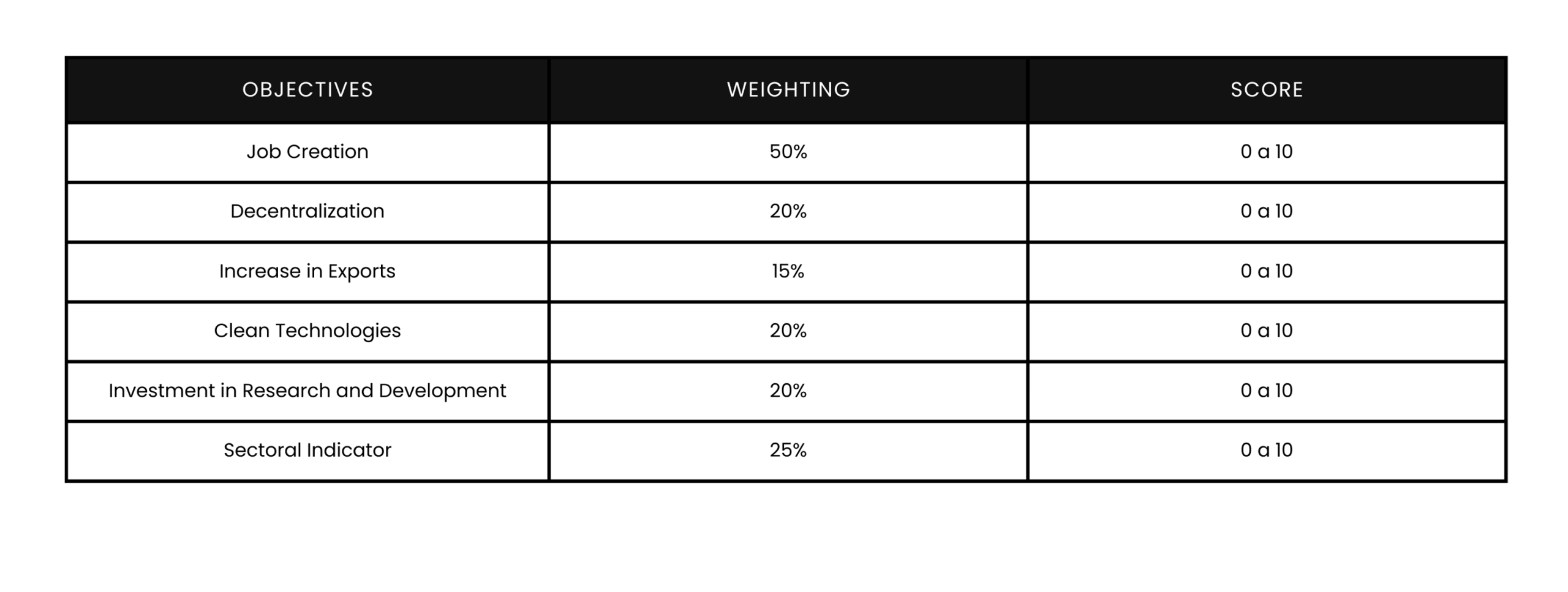 The granting of the IRAE exemption benefit is subject to the score obtained in the indicator matrix prepared by the Investment Law Application Commission (COMAP) based on information provided by the investor. The indicators composing the matrix for these projects are: