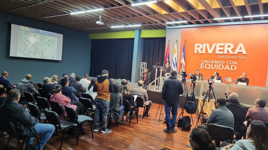Por último, el subgerente Arq. Néstor Fernandez, subgerente del Área del Sistema Nacional De Puertos, realizó una presentación sobre el desarrollo de la Terminal Integrada Multimodal Puerto Seco Rivera (TIMPSR), destacando la conexión con Ruta 5, y la vía ferroviaria, así como brindó detalles técnicos del proyecto. Por último comentó, la potencialidad logística que se puede generar en Rivera, almacenando carga en la TIMPSR, para luego distribuir a Brasil a través del modo aéreo, ya que se está desarrollando la modernización y reacondicionamiento del Aeropuerto Internacional de Rivera.