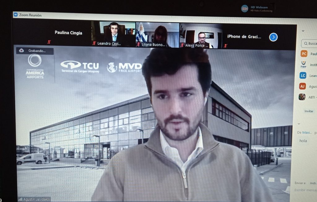 En primer lugar, en representación del Aeropuerto Internacional de Carrasco y la logística aérea de régimen libre, expusieron el Sr. Maximiliano Lema, Head Client Advisory y el Sr. Agustin Jasidakis, Senior Client Advisor, quienes comentaron las ventajas del régimen de aeropuerto libre por estar ubicados a 2 horas de las principales ciudades de América del Sur, contar con una plataforma multimodal y una normativa beneficiosa que nace de la concordancia público-privada que caracteriza al Uruguay y su interés nacional en el sector logístico. Seguidamente describieron los servicios específicos que ofrecen y las ventajas de entrar a la región por Uruguay.