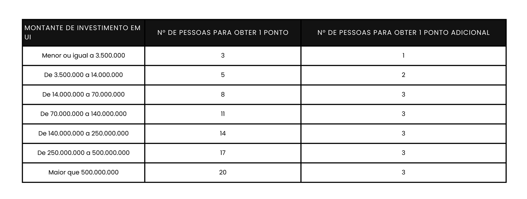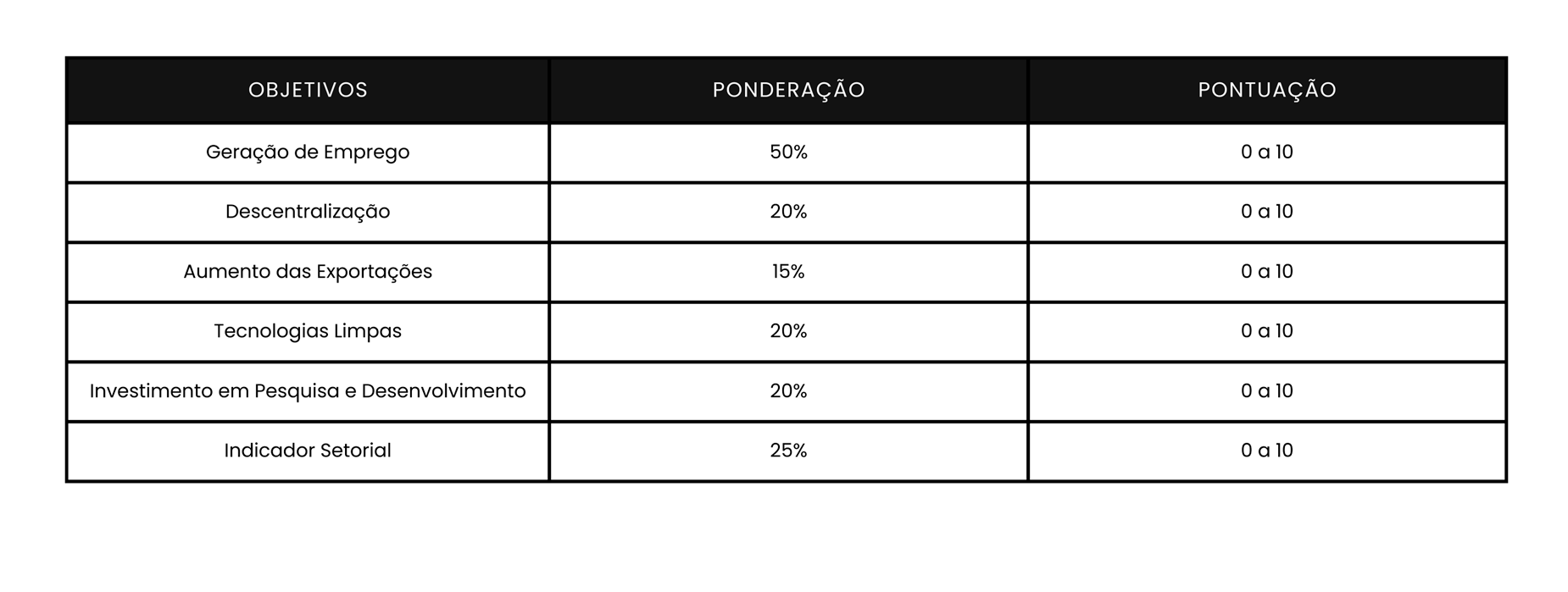 A concessão do benefício de isenção do IRAE está sujeita à pontuação obtida na matriz de indicadores elaborada pela Comissão de Aplicação da Lei de Investimentos (COMAP) com base em informações fornecidas pelo investidor. Os indicadores que compõem a matriz desses projetos são: